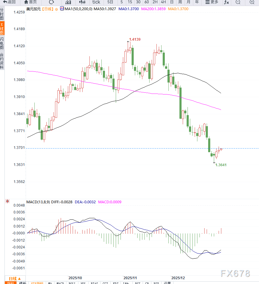 当前美元兑加元的走势更多受到年末流动性下降和仓位调整影响,而非基本面发生实质性变化。美联储虽保留进一步降息空间,但节奏偏谨慎;加拿大央行则因通胀稳定而维持观望,政策分化有限。