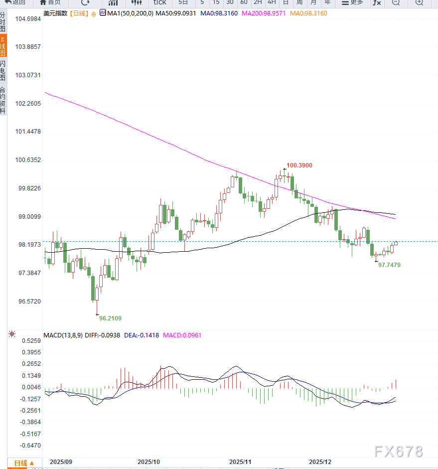 从日线结构看,美元指数虽短线反弹,但整体仍处于中长期下行趋势中的技术修正阶段。指数目前运行在主要中期均线下方,反弹更多体现为空头回补而非趋势反转。动能指标方面,RSI虽自低位回升,但仍未进入强势区间,显示上行动能有限。若无法有效站稳98.50—99.00区间,美元指数反弹空间可能受限,下方仍需警惕再度回探年内低位的风险。