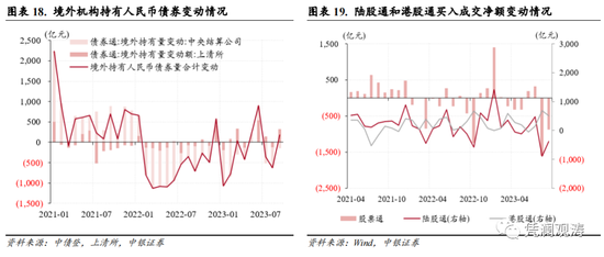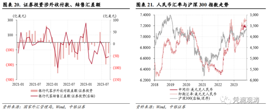 值得一提的是,9月中旬以来,人民币汇率止跌企稳,截至月末收盘价上涨0.6%,但A股仍然延续下跌态势,沪深300指数累计下跌1.3%,北上资金累计净流出327亿元(见图表21)。这表明,人民币汇率涨跌并不是证券投资项下资本流动的决定因素。