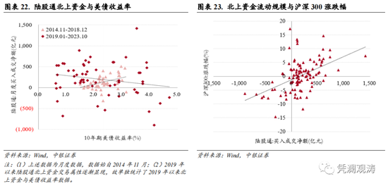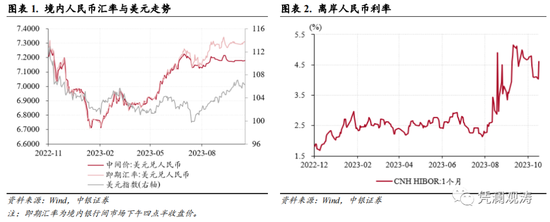 之所以9月中旬以来人民币汇率与股市表现背离,一定程度上或是受到了美债收益率与离岸人民币利率上升的影响。一方面,美债收益率衡量的是北上资金的机会成本,二者存在负相关关系(见图表22),9月份10年期美债收益率从4.0%升至4.6%,受此影响,包括中国在内的新兴市场外资延续上月净流出态势。国际金融协会(IIF)数据显示,9月份非居民从新兴市场投资组合中撤资138亿美元,股市、债市分别净流出120亿和18亿美元。另一方面,离岸人民币流动性收紧,有助于稳定人民币汇率,但带来的另一结果是,提高了陆股通投资者拆借人民币成本,加剧北上资金净流出,而由于后者是A股重要的边际增量资金,因此对境内股市走势影响较大(见图表23)。