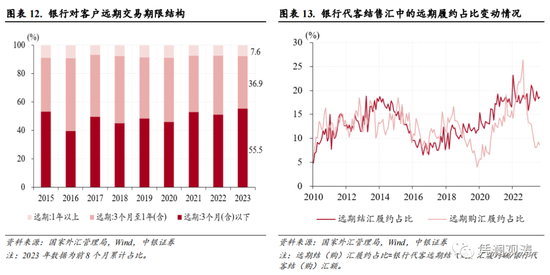 从远期履约情况来看,由于银行对客户的远期合约期限集中在3个月附近(见图表12),最近远期结汇对冲比例大幅下滑的影响尚未完全体现在远期结汇履约数据中,9月份远期结汇履约占比回升0.3个百分点至18.6%,总体较为稳定。而由于远期购汇对冲比率自2022年10月以来出现明显下滑,因此近期远期购汇履约占比已经降至近年来低位,9月份环比回落0.6个百分点至8.6%(见图表13)。