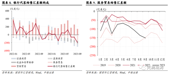 货物贸易结售汇顺差环比降幅较大。9月份,银行代客结售汇差额中,货物贸易结售汇顺差由上月256亿美元收窄至149亿美元,贡献了银行代客结售汇逆差环比增幅的80%;服务贸易结售汇逆差环比增加16亿美元至152亿美元,创2019年以来同期新高,贡献了银行代客结售汇逆差环比增幅的12%(见图表8)。据国家移民管理局通报,2023年中秋、国庆假期出境594.8万人次,较上年同期增长1.4倍[2]。假期出境需求旺盛导致服务贸易购汇金额延续高位,9月份为250亿美元,创2019年以来同期新高(见图表9)。