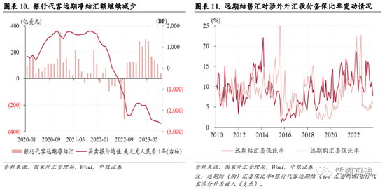 市场主体汇率风险对冲意识减弱。9月份,中美利差倒挂程度进一步加深,1年期人民币美元远掉期均值继续扩大至-2607BP,创2008年7月以来新低(见图表10)。当月,远期结汇签约额与远期购汇签约额齐降,前者较上月减少90亿美元,大于后者降幅21亿美元,带动银行代客远期净结汇累计未到期额环比降幅扩大52亿美元,贡献了银行结售汇总逆差增幅的40%(见图表8)。与之对应的是,远期结汇对冲比率环比回落3.4个百分点至7.9%,创2020年7月以来新低,而远期购汇对冲比率不升反降,环比回落0.6个百分点至6.0%,显示在汇率持续承压背景下,市场进行远期结汇的意愿偏弱,远期购汇则更加趋于谨慎(见图表11)。