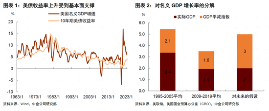 那么,基于这些数据,美债利率5%的定价合理吗?如果看2008年次贷危机后的十多年,美债利率从未达到5%,这似乎指向目前利率水平过高,不可持续。但如果看次贷危机前的1995-2005年,10年期美债收益率均值为5.3%,美国名义GDP同比增速均值5.4%,美债利率与名义GDP增长大致相当。如果以那段时间作为参考,那么当前6%~6.5%的名义GDP增速或许应该对应6%以上的美债利率,而非5%(图表1)。