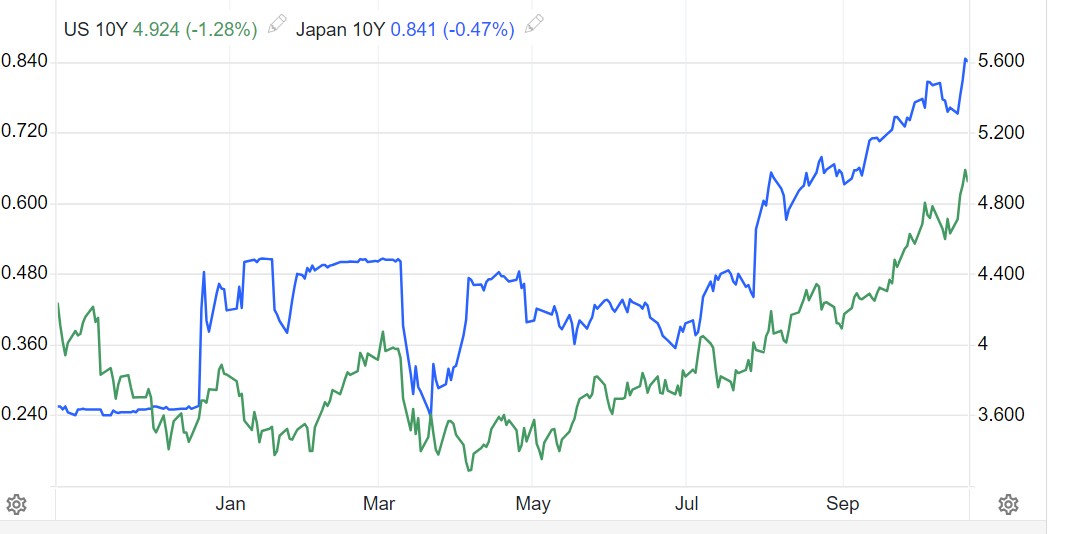 美国10年期国债收益率目前在4.93%附近,几乎是日本10年期国债收益率(0.84%左右)的接近6倍。日本央行行长植田和男周五表示,日本央行将继续耐心地保持宽松的货币政策,以实现稳定、可持续的2%通胀目标。