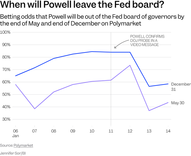 预测平台Polymarket的数据显示,在鲍威尔于1月11日发布视频回应调查后不久,关于他将在5月底以及年底前离开美联储理事会的概率均出现暴跌。