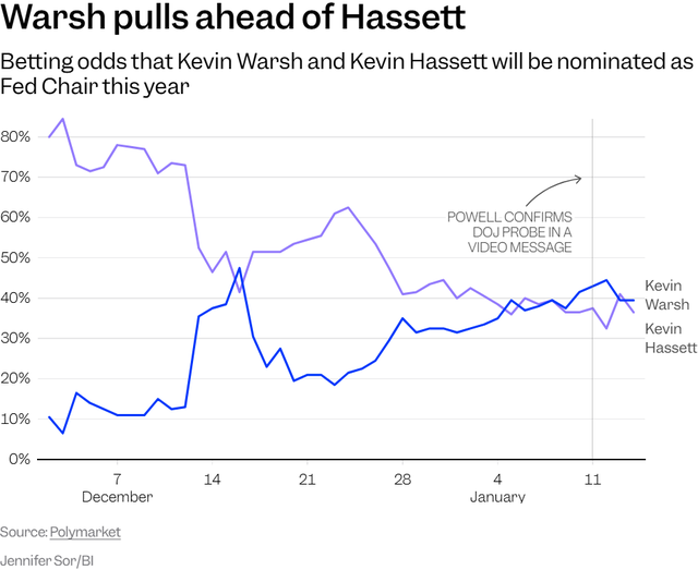 预测市场同时也调整了对特朗普盟友凯文・哈塞特(Kevin Hassett)获提名接任美联储主席的概率预期。在美国司法部调查消息传开前后,美联储主席候选人名单中立场更为鹰派的凯文・沃什(Kevin Warsh),在Polymarket平台的支持率开始反超哈塞特。