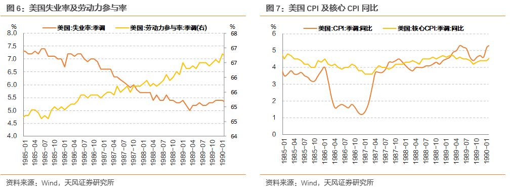 1988年到1989年,美国经济继续展现出一系列积极的迹象。就业维持在稳定区间,劳动力参与率在这两年内基本保持稳定,位于66%左右。CPI同比增速则维持在4%-5%区间水平。