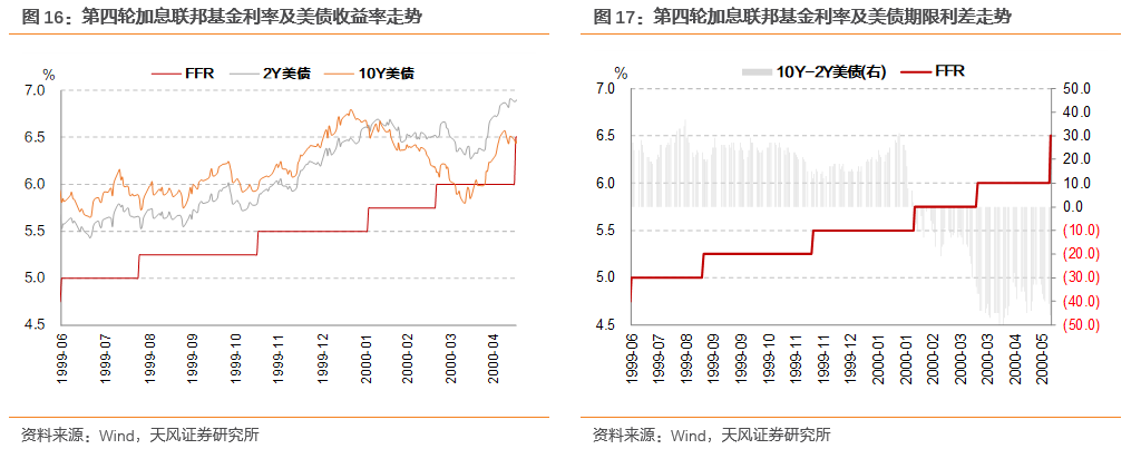 本轮加息从1999年6月开始,持续至2000年5月结束,联邦基金利率从4.75%上行至6.5%,共上调175bp,共加息6次。