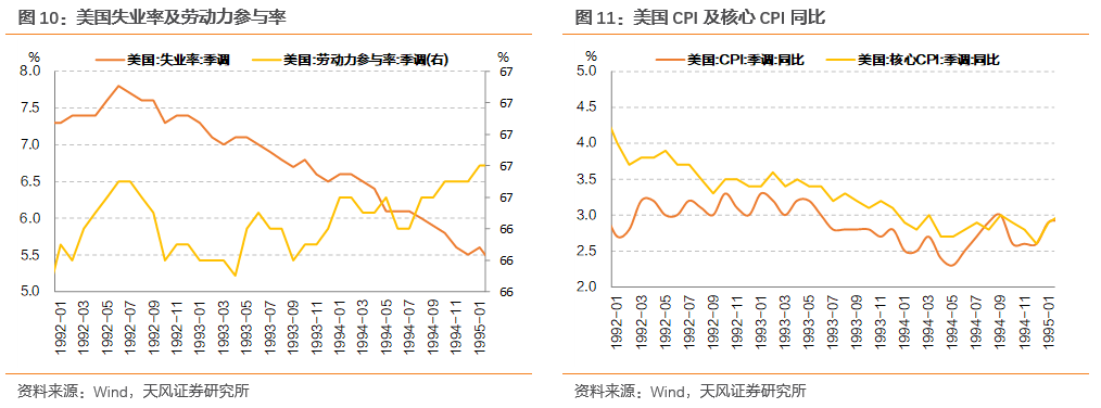 加息过程中,美国经济表现良好。1994年二季度起,GDP同比增速维持在4%以上,经济活动增加的推动下,就业增长持续,失业率小幅下降。同时,通货膨胀率也有所下降。1994年4月,CPI同比增速仅2.4%,后虽有所上行,但整体控制在3%以下水平,位于美联储适意区间内。