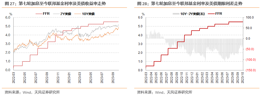 在加息周期内,美债利率贴近并持续跟随联邦基金利率小幅上行至加息结束,2年期美债触及5.21%,10年期美债触及5.22%,极为贴近联邦基金利率5.25%。