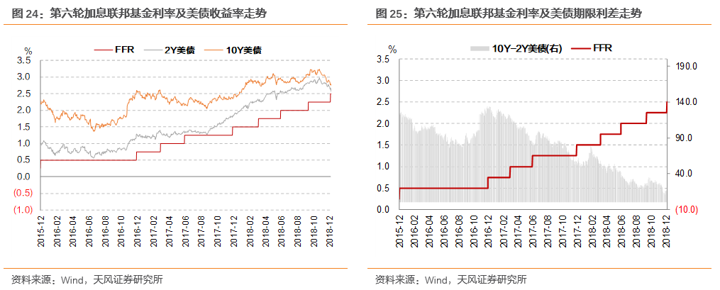 2015年12月,美联储开启货币政策正常化进程。本轮加息从2015年12月开始,持续加息至2018年12月,共进行了9次加息,联邦基金利率目标范围从0%-0.25%上调至2.25%-2.5%,共加息225bp。其中,2017年、2018年加息节奏明显快于前两年,分别进行了3次和4次加息,每次加息均25bp。