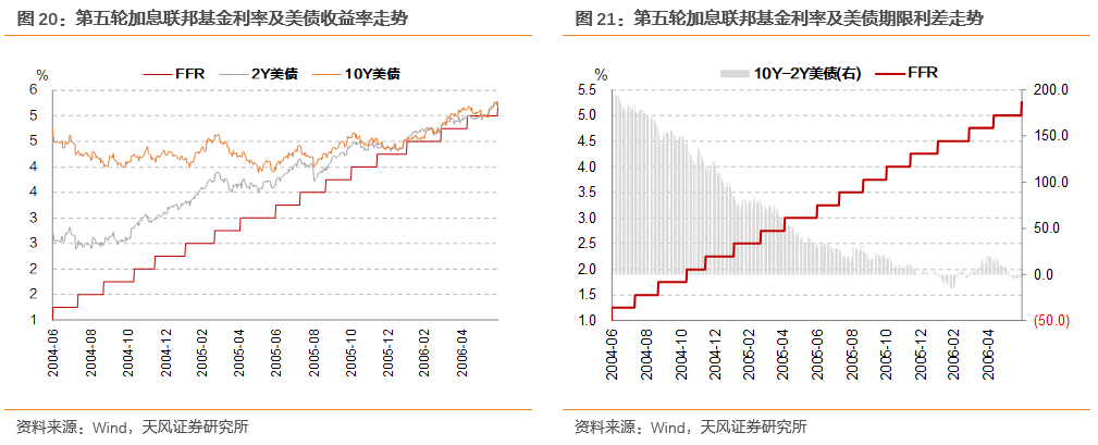 在1999年6月至2000年5月的美联储加息期间,2年期美债最大上行126bp到达阶段性高点6.69%,10年期美债上行114bp触及高点6.79%,后转而下行。时间上,10年期美债提前4个月下行,2年期美债则相对较晚,提前3个月下行。在接近加息结束时,2年期和10年期美债于加息结束前1个月同步开始回调,上行60bp左右,长短端均高于联邦基金利率水平。