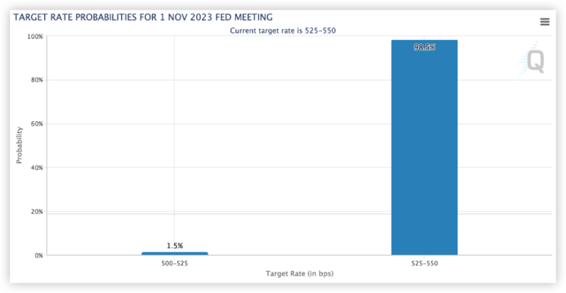 下一次FOMC会议将于10月31日至11月1日举行,芝商所fed watch tool显示,期货市场预计美联储在本次会议上将维持利率不变。