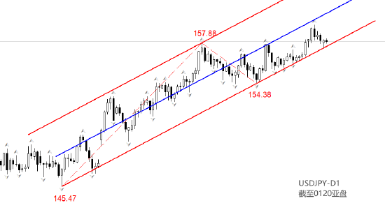 行情方面,USDJPY日线级别运行于图中 通道线内部。1月14日形成的顶分型结构触及通道中轨,随后开始回落。市价重新接近通道下轨。如果下轨支撑有效,未来USDJPY有可能展开新一轮上涨走势,中轨和上轨是需要重点关注的阻力位。如果今日以长阴线收盘,且下轨被跌穿,则USDJPY可能迎来一轮 更大级别的回调走势。