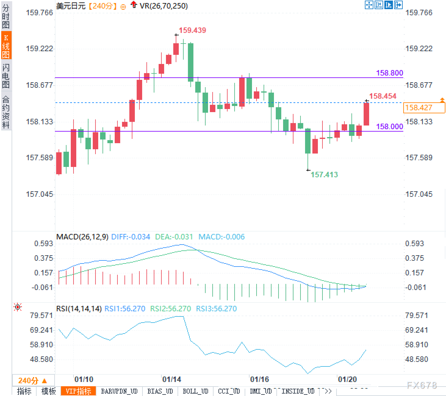 周二(1月20日)美元兑日元欧市早盘交投158.50附近,进入技术性修复阶段。此前价格一度冲高至159.439,创下18个月新高,随后回落至157.413,形成明显震荡格局。当前价位处于区间中上部,上方158.800构成初步压力,下方158.000则是关键心理支撑。