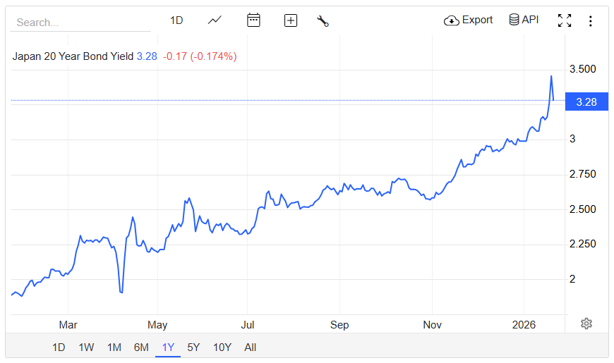本周二,日本债券市场遭遇猛烈抛售,长期收益率飙升至创纪录高位。市场对首相高市早苗在2月8日大选前的财政政策感到担忧,叠加日本央行缩减大规模购债的影响,导致市场波动剧烈。周三,日债收益率已从高位回落,20年期国债收益率下行10个基点至3.245%。作为市场基准的10年期国债收益率也下行5个基点,报2.290%。
