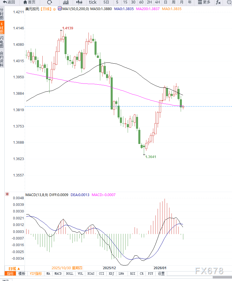 周二亚洲早盘,美元兑加元小幅走高,交投于1.3835附近,但反弹力度有限。市场情绪整体偏谨慎,主要原因在于美欧之间围绕格陵兰问题的摩擦持续发酵,贸易担忧情绪再度成为影响美元走势的重要变量。