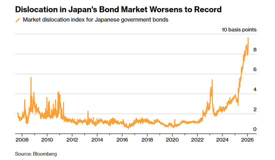 本周,彭博社一项衡量日本国债收益率与其理论价值偏离程度的指数飙升至历史新高,这一信号表明,日本国债市场的定价错位问题正持续恶化。