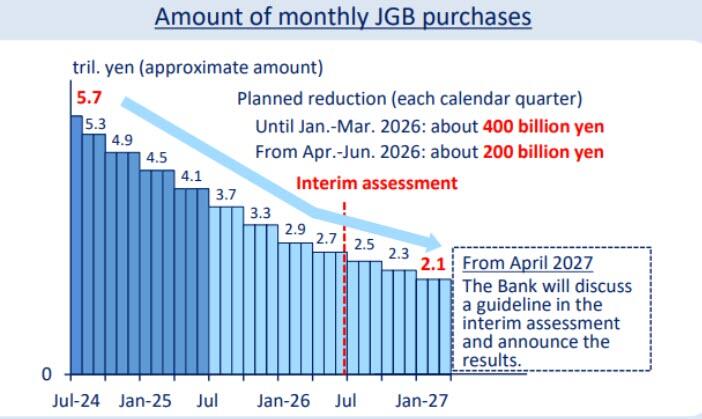 日本央行正持续削减购债规模。2024年年中时,央行每月购买5.7万亿日元国债,目前已降至2.9万亿日元,预计明年初将进一步降至2.1万亿日元。