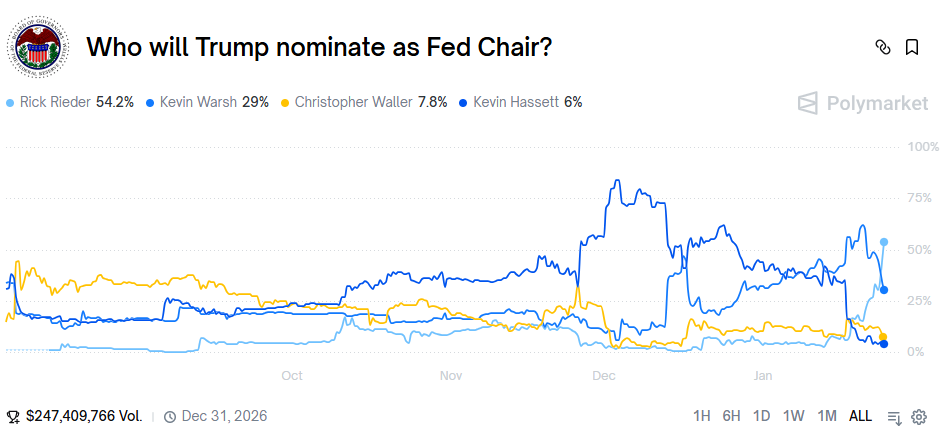 根据预测平台Polymarket的数据显示,截止本周六(1月24日),里德尔当选美联储主席的概率已飙升至54%,远远领先于排名第二的沃什(29%),而年初时里德尔胜出的概率仅为4%。