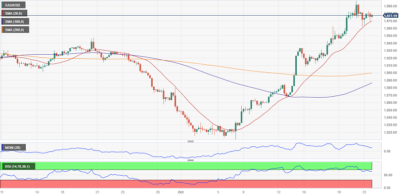 周二(10月24日)亚市盘中,美元指数小幅下探,一度刷新近一个月低点至105.43,帮助金价一度触及1980关口,目前现货黄金交投于1977.52美元/盎司附近。FXStreet首席分析师Valeria Bednarik撰文,对黄金技术前景进行分析。