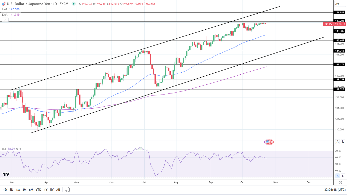 14天RSI为58.79,表明美元/日元突破150.293阻力位至151,然后进入超买区域。