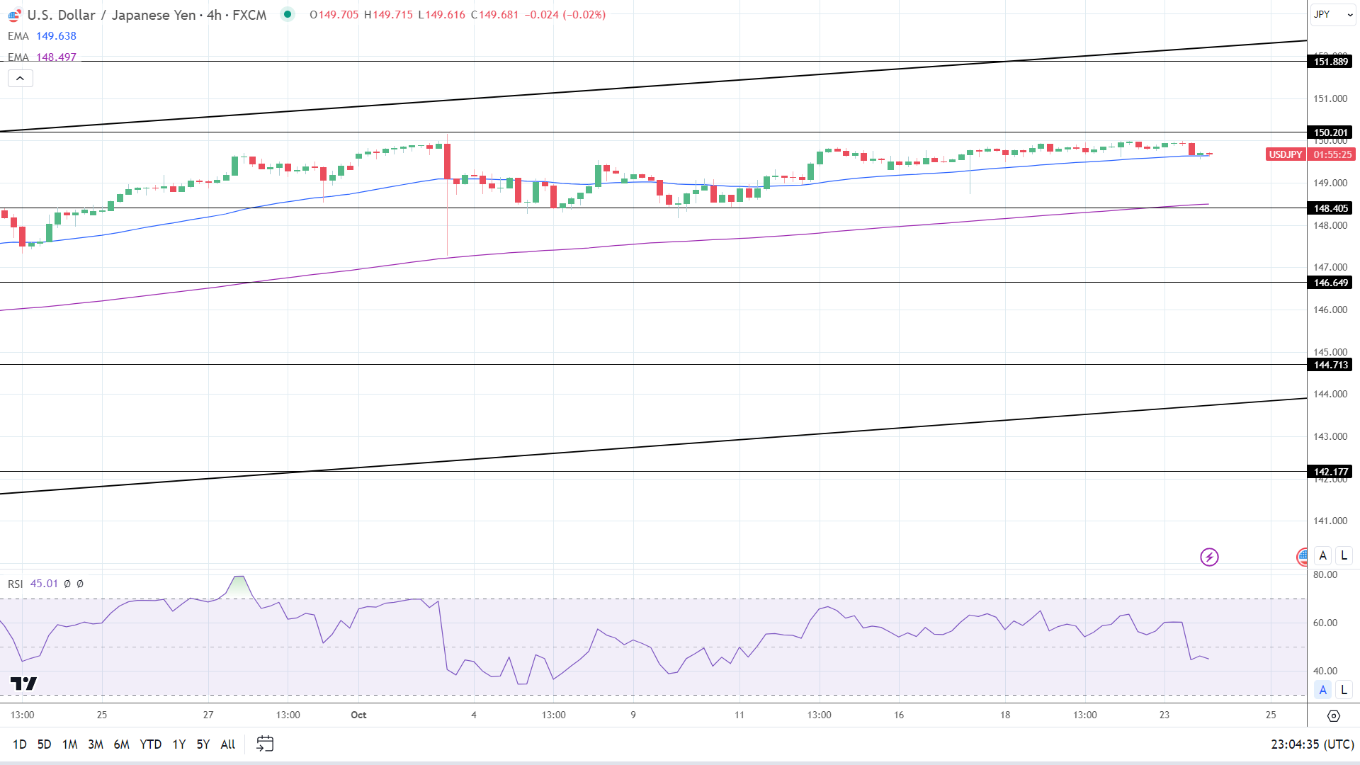 45.01的14-4小时RSI表明,美元/日元在进入超卖区域之前跌破50日均线和149关口。