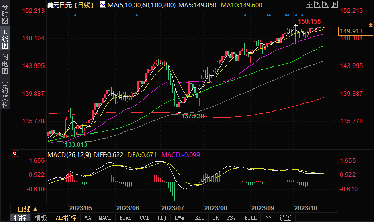 周一(10月23日), 美国10年期国债收益率升至5%以上,美元全面受到支撑,但并未大幅走高,而当天早些时候,日元短暂走软,突破150关口。