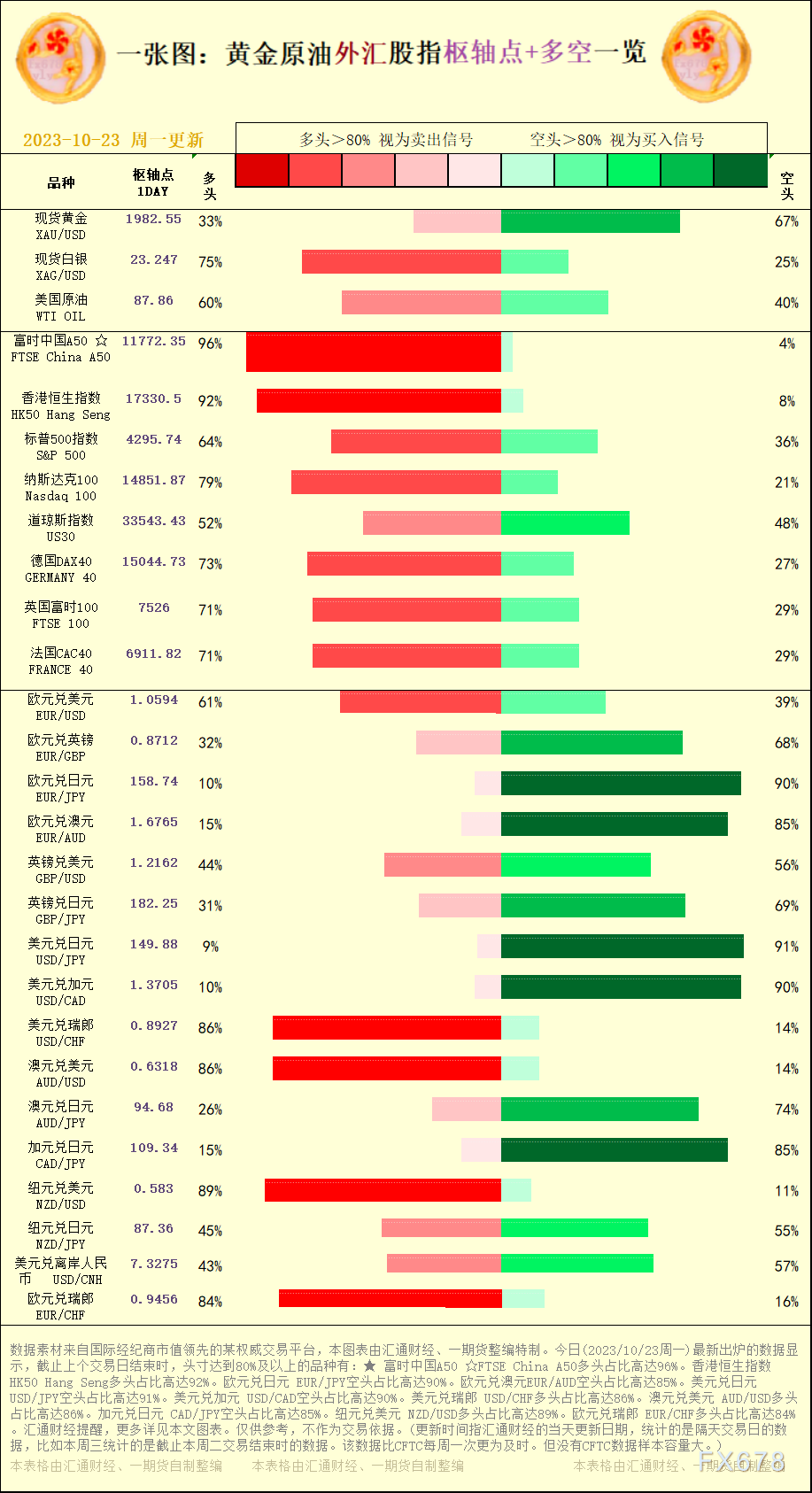 一张图:黄金原油外汇股指“枢纽点+多空占比”一览。今日(2023/10/23周一)最新出炉的数据显示,截止上个交易日结束时,头寸达到80%及以上的品种有:★ 富时中国A50 ☆FTSE China A50多头占比高达96%。香港恒生指数 HK50 Hang Seng多头占比高达92%。欧元兑日元 EUR/JPY空头占比高达90%。欧元兑澳元EUR/AUD空头占比高达85%。美元兑日元 USD/JPY空头占比高达91%。美元兑加元 USD/CAD空头占比高达90%。美元兑瑞郎 USD/CHF多头占比高达86%。澳元兑美元 AUD/USD多头占比高达86%。加元兑日元 CAD/JPY空头占比高达85%。纽元兑美元 NZD/USD多头占比高达89%。欧元兑瑞郎 EUR/CHF多头占比高达84%。汇通财经提醒,更多详见本文图表。仅供参考,不作为交易依据。
