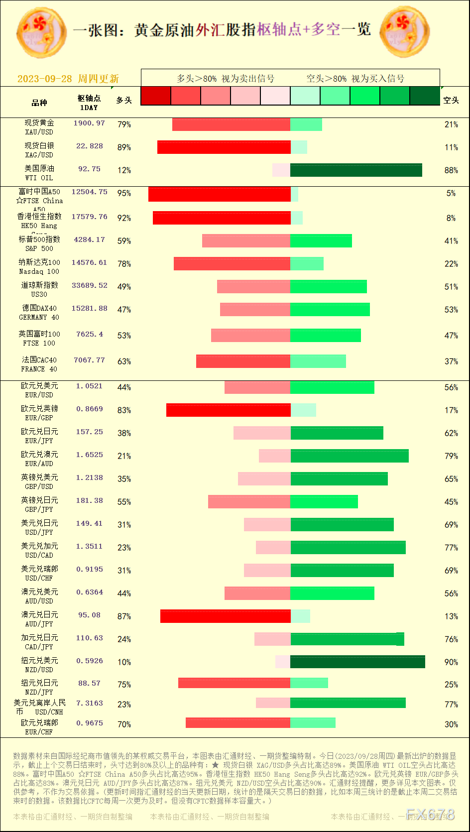 xm外汇新闻:一张图:2023/09/28黄金原油外汇股指"枢纽点+多空占比"一览