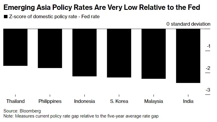 东南亚和美国之间的基准利率差距持续扩大,因为印度尼西亚、菲律宾和马来西亚等国家的央行在今年上半年暂停了加息。马来西亚的基准利率现在比美联储基金利率上限低250个基点,创下历史新低。也比五年平均利率差距低2.3个标准差。印度尼西亚、菲律宾和泰国的同样指标分别为-2.2、-1.8和-1.7。