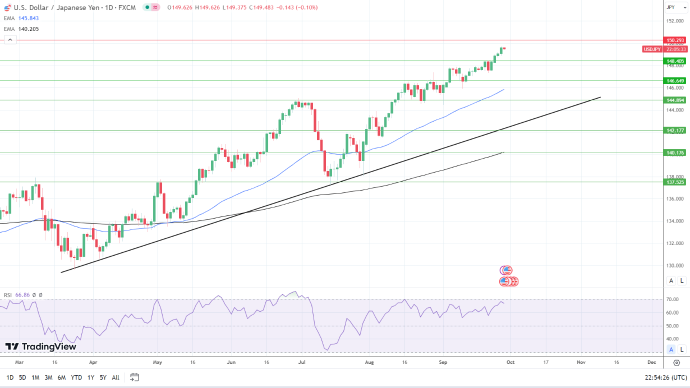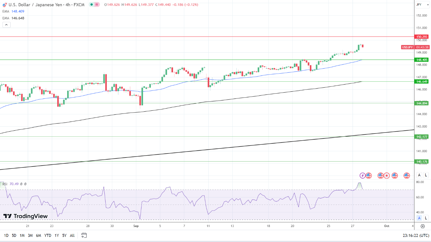 14日RSI为66.38,表明美元/日元在进入超买区域之前将升至150。