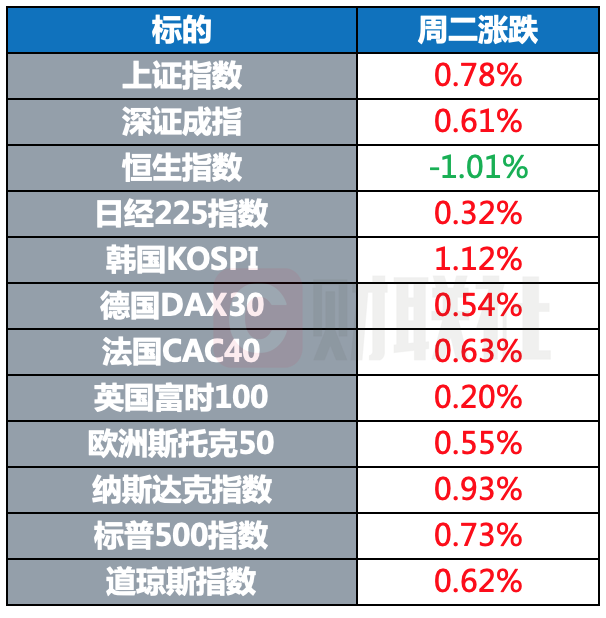 全球主要股指周二普涨,美股三大指数集体收涨,纳指涨近1%,纳斯达克中国金龙指数大涨4%。