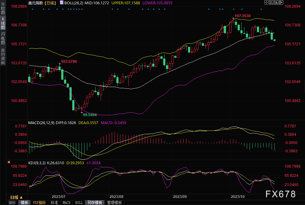 周二(10月24日)亚市盘中,随着美债收益率下滑,美元指数维持日内跌势,目前交投在105.50附近。