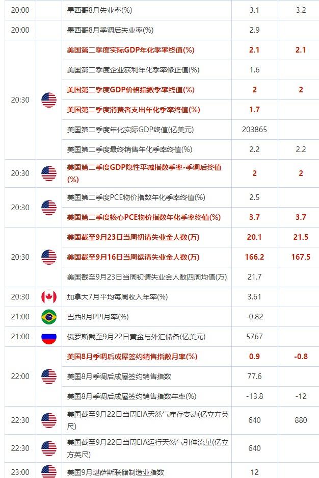 20:30 美国截至9月23日当周初请失业金人数(万) , 前值 20.1 , 预期值 21.5 , 公布值:待发布
