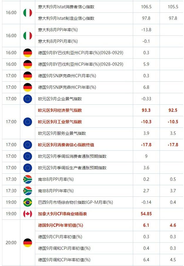 9月28日,投资者需要关注的重点数据:欧元区9月经济景气指数,欧元区9月工业景气指数,欧元区9月消费者信心指数终值,加拿大9月CFIB商业晴雨表,德国9月CPI年率初值,美国截至9月23日当周初请失业金人数,美国截至9月16日当周续请失业金人数,美国8月季调后成屋签约销售指数月率。 需要关注的大事件包括芝加哥联储主席古尔斯比发表讲话,英国央行货币政策委员格林发表讲话。