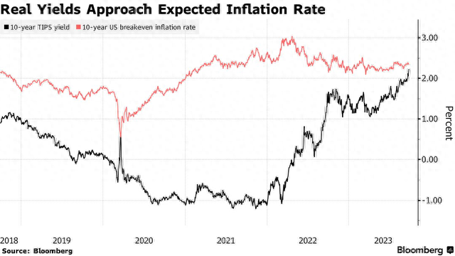 当债券市场的实际收益率高于预期通胀率时,这表明更高的借贷成本将产生更大的影响。