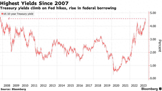 他说,“我认为美国经济可以消化4.5%的10年期国债收益率,但超过5%的收益率持续几个月将是难以承受的”。