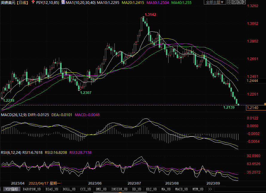 周二(9月26日),英镑兑美元连续第五个交易日下跌,最新报1.2142美元,接近3月以来最低点。8月通胀数据降温、英国9月商业活动调查初步结果显示景气疲软程度远超预期、以及英国央行决定维持利率不变等因素,使英镑贬值1.1%。交易员们认为,在经济放缓、通胀率走低的情况下,英国央行上周维持货币政策不变,几乎可以确定英国央行已经到了加息行动的尾声。而从宏观经济数据和各国央行的言论中可以越来越清楚地看出,美国比英国更有可能继续加息。随着收益率优势减弱,预料英镑还将要承受被抛售的压力。目前日线图上,英镑/美元呈现了瀑流式的下跌形态,技术指标继续向超卖区域延展。若无重大利好因素刺激,镑美恐怕将延续着下跌的走势,目标将瞄向今年2月份到过的低位区域(1.20-1.19区间)。