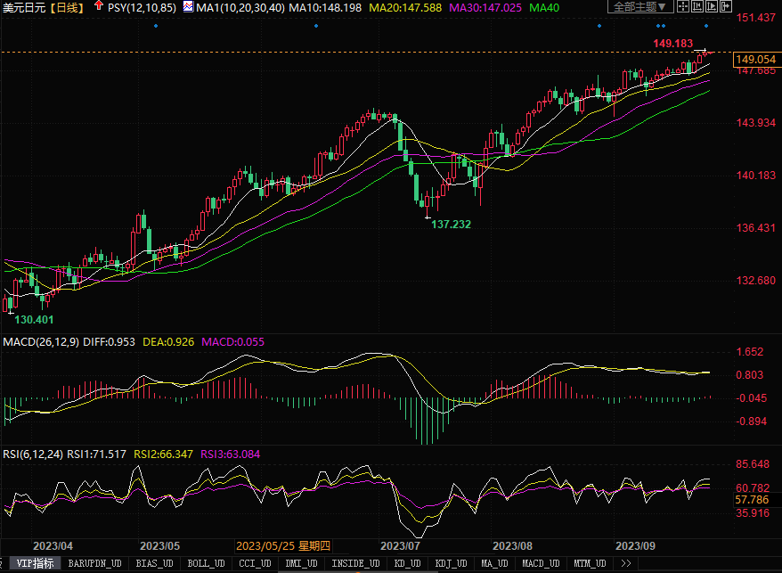 周二(9月26日),美元兑日元继续攀高,盘中曾创下年内新高149.18,尽管当日日本财务大臣铃木俊一周二表示,政府正在“以高度的紧迫感关注汇率走势”,也未能抑制日元的颓势。市场选择无视日本政府的口头警告。随着美联储更多官员支持利率长期更高的政策,美国10、30年期债券收益率分别都创下相应历史时期的高点。美债对应日债利率差的进一步拉宽,继续刺激着套利交易的前行。现在唯一能喝止日元继续贬值的影响因素,就看日本央行是否会如上年那般实际入市干预。在无干预行动出现之前,料交易员仍将会谨慎推动美元/日元往高点攀爬。若汇价触及上年警戒水平150,日本政府仍无动静的话,则说明今年的警戒水平要往上提升。需要提醒的是,纯从日线图来观察,技术指标顶背离迹象越来越明显,需时刻防范美元/日元出现大幅调整回落的风险发生。
