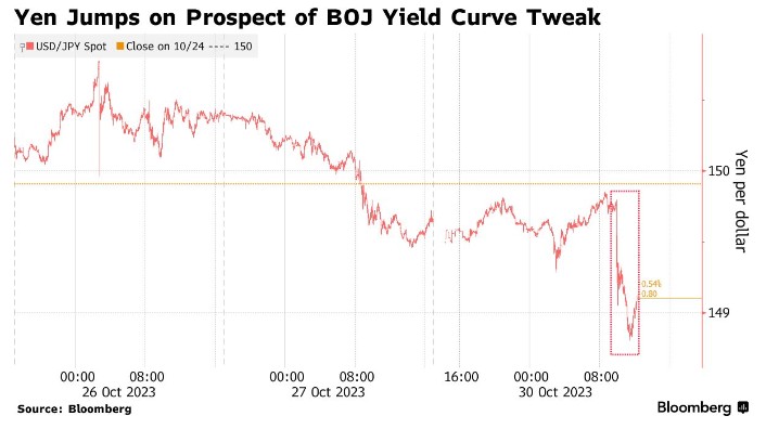 报道称,日本央行政策制定者正在考虑让10年期政府债券的收益率升至1%以上。消息公布前,日元兑美元汇率较低,但随后立即上涨约0.5%,升至1美元兑148.81日元左右,为10月11日以来的最高盘中水平。