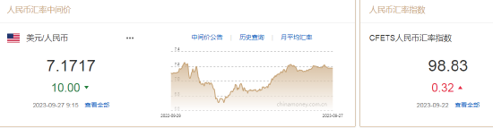9月27日,人民币中间价报7.1717,上调10点,上一交易日中间价报7.1727。