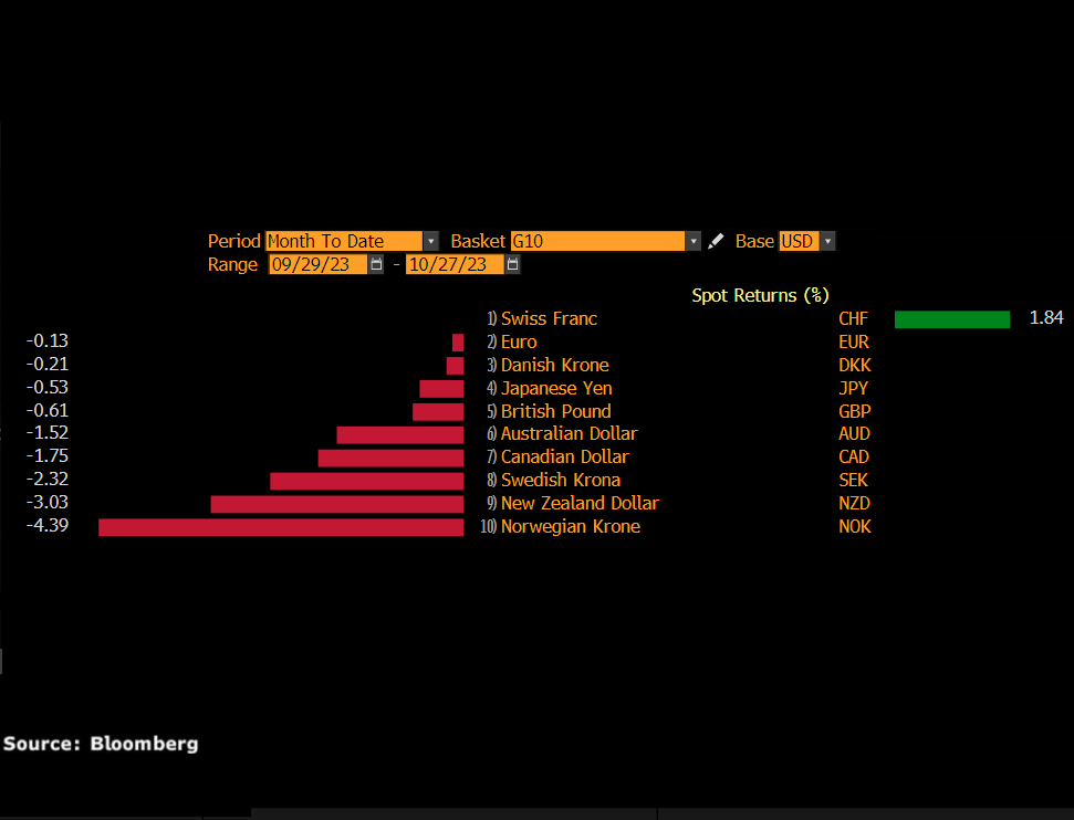 美元指数追踪美元兑一篮子六种不同G10货币的表现。值得注意的是,本月迄今,美元兑几乎所有G10货币(瑞士法郎除外)均出现升值。