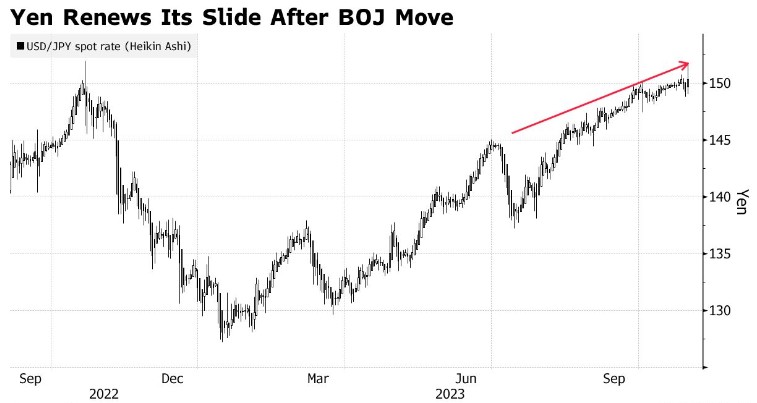 该央行仍然是世界上“仅存的鸽派”,这与其他主要央行采取的鹰派政策持强硬态度的国家形成鲜明对比,这使得日本的债券收益率远低于美国和欧洲。随着日本投资者将资金转移到其他地方以获取更高的收益率,这对日元造成了持续的下行压力。