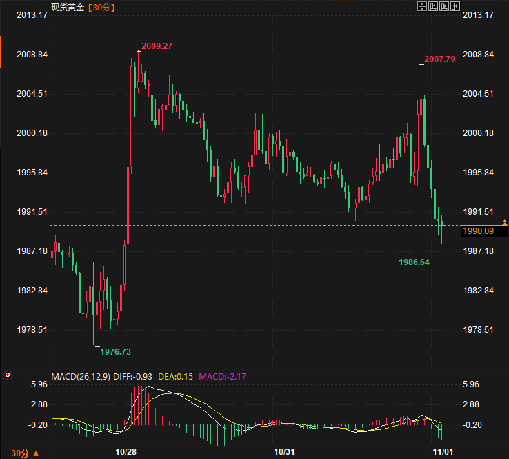 截至发稿,现货黄金现报1991.37美元/盎司,日内下跌0.22%。