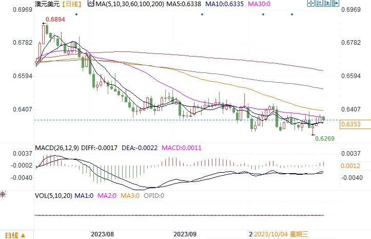 周一(10月30日),澳元兑美元上涨了0.3%,至0.6374美元,盘中最高至0.6383。澳洲统计局(ABS)周一公布的数据显示,9月名义零售销售比8月增长0.9%,比上月0.3%的增幅有所加快。分析师原预计9月增幅为0.3%。这使得市场对11月加息的押注从之前的58%略微上升至61%。这或许就是澳元近几个交易日呈反弹的主要促动力。此外,美元指数在获利回吐和美联储11月份暂停加息预期的打压下走软也对澳元构成了一定的支撑。而大宗商品铁矿石价格走高也给予商品货币澳元一定的助力。尽管如此,澳元的脆弱险性仍未得到解除,汇价仍处在全年的低位区域,目前上方0.64依旧构成较重的压制。日线图上,澳元/美元渐渐回到布林带通道中轨线之上,上方若能冲破0.6400-0.6450阻力区域,则有望走出一波较为明显的反弹走势。相反遇阻的话,澳元/美元恐还需继续保持在低位区域(0.6250-0.6380)横盘的走势。小时图上则略显超买,或有回踩调整的风险。