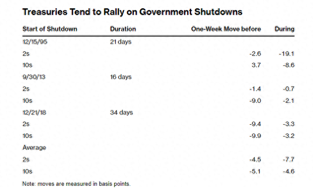 过去的政府停摆对美国国债有利,因为它仍然是投资者的避风港。正如富国银行的分析师所指出的,在1995年、2013年和2018年底的政府关门期间,两年期和10年期美国国债的收益率都有所下降。