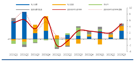 再配合美国最近的经济数据分析。1)美国Q3实际GDP环比折年率升至4.9%(预期4.3%,前值2.1%),季度反弹明显,主要拉动来自私人消费,表明美国经济的内生需求依然强劲。2)9月CPI、PCE、零售销售、通胀预期均出现不同程度的走差,表明通胀粘性较大、短期难以回落,抗击通胀的路阻且长。3)劳动力市场供需两旺,高频数据显示持续申请失业金有抬升,但仍在可控水平,预计本周五的10月非农数据不会大幅超出市场预期。