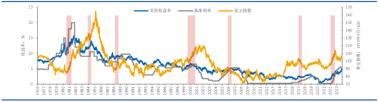 关于此次美债收益率上涨的背后原因,主要有三点:一是,实际利率走高,增长韧性而非通胀走高;以10年期美债收益率为例,名义利率走高、实际利率(TIPS)走高,但通胀预期并没有变化,这表明名义利率的上涨来自实际利率推升,而实际利率上涨的根本是源自市场重新定价经济预期,愈加认可美国经济的韧性。二是,期限溢价抬升,长端的风险补充增加(熊陡);与去年上涨不同,此次长端的10年期利率上涨,而短端3月期基本持稳,期限溢价由倒挂快速转正,这表明市场增加美债远期偿付风险的担忧。三是,美债利率和美元指数同步走强,内外流动性同时收紧;回顾历史,两者同步走强主要发生在加息时,尤其是加息初期,这表明美国内部由于高利率流动性收紧的同时,离岸发达和新兴市场“美元荒”再度加剧。